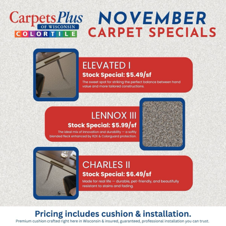 We can't wait to see you at one of our four flooring locations. While there, you can browse our incredible selection of flooring options, including carpet, hardwood, laminate, vinyl, tile, bamboo, area rugs, and much more. We invite you to come and see us at either our Plover, Madison West, Madison East, or Janesville, WI, location to browse our selection of Shaw, Mohawk, and CarpetsPlus COLORTILE flooring.